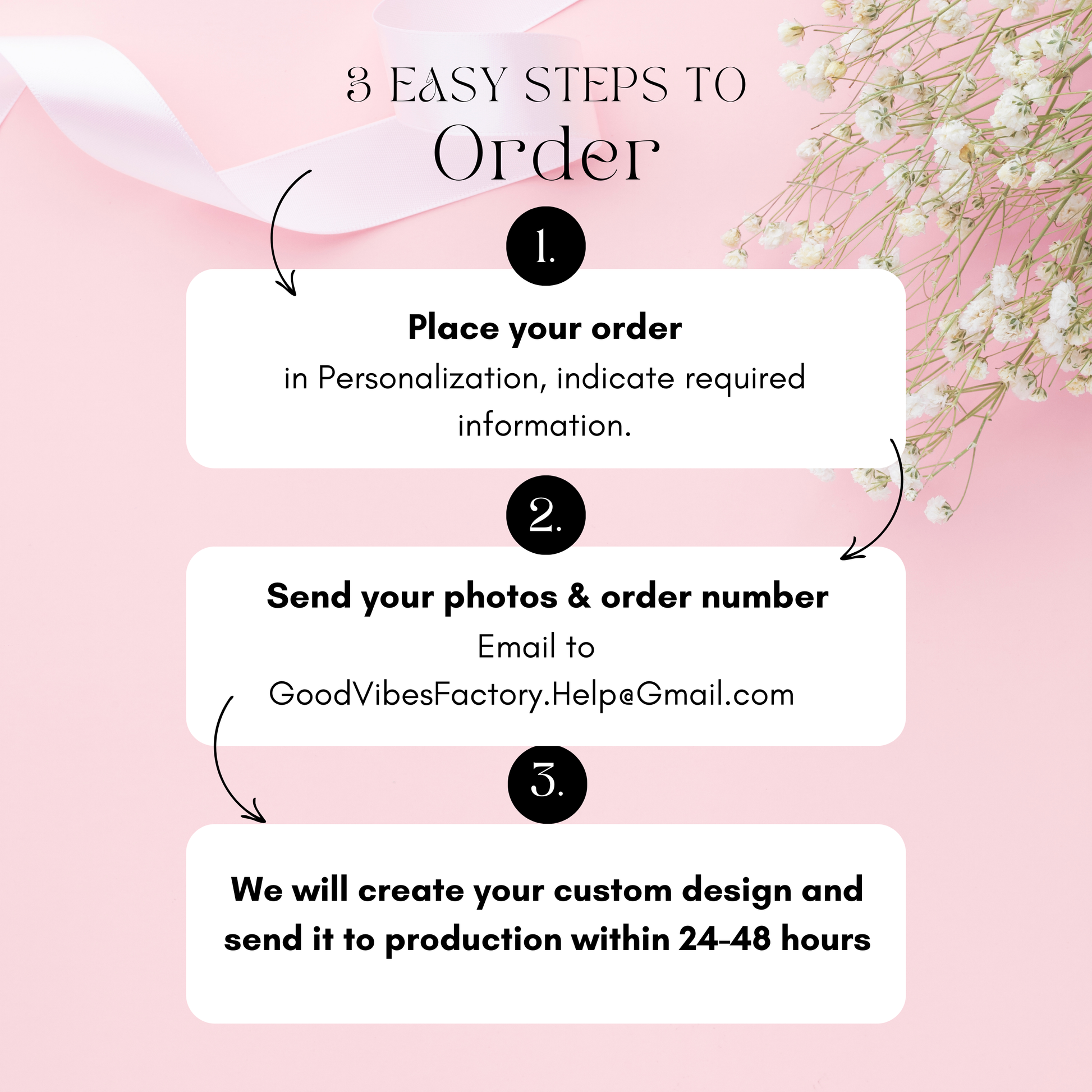 After placing your Order, please send your photo with order number to GoodVibesFactory.Help@Gmail.com.